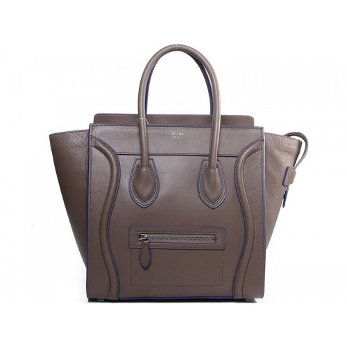 Geantă Celine Luggage medie din piele de vițel, kaki, cu finisaje albastre
