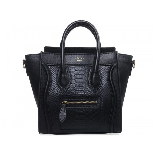 Celine Bagaj Mini Tote din piele de vițel neagră cu piele de șarpe neagră