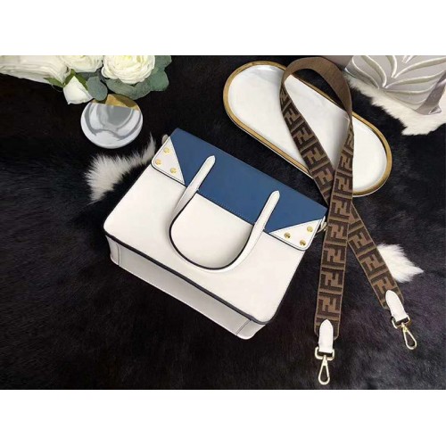 Pungă medie de tote. Mânerul dublu, cu clapă care se pliază în lateral, vă permite să transportați geanta manual, sau să o purtați pe umăr sau pe corpul transversal datorită curelelor de umăr detașabile. Căptușeală cu buzunar plat. Fabricat din amestec de piele de vițel bej și albastru închis. Decorat cu micro știfturi plate. Curea de umăr cu panglică cu motiv FF. Metalware cu finisaj auriu.