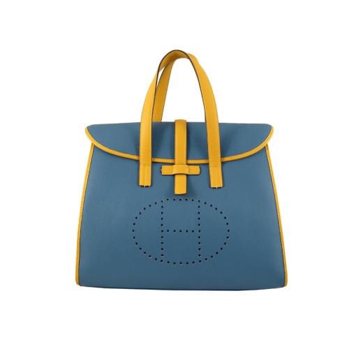 Geantă Hermes 08c Flap albastră cu garnitură din piele galbenă