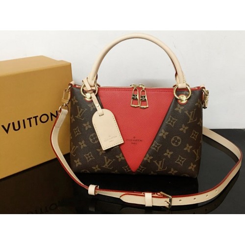 Inspirat de & quot; V& quot; de la Vuitton, geanta de mână V Tote este modelată din pânză Monogram cu un panou triunghiular mare din piele granulată. Este accesorizat cu feronerie de culoare aurie și o etichetă de nume din piele și poate fi purtat ca geantă de mână sau peste umăr datorită curelei detașabile.