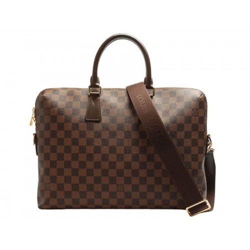 Călătoria Porte-Documents în arestarea pânzei Damier Ebene este o versiune mai compactă și mai casual a Călătoriei Porte-Documents. Cu toate acestea, poartă cu ușurință un 15” laptop în stil fin.
