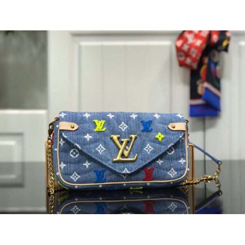Această ediție specială a lanțului Louis Vuitton New Wave pochette face parte din colecția sezonieră LV Denim. Fabricat din denim spălat, este matlasat cu modelul de undă semnătură al liniei și împodobit cu broderii colorate Monogram. Acest portofel este suficient de mare pentru a ține un smartphone, în timp ce un buzunar cu fermoar protejează obiectele de valoare.