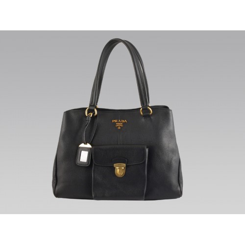Geantă medie Prada din piele de vacă cu buzunar frontal, neagră