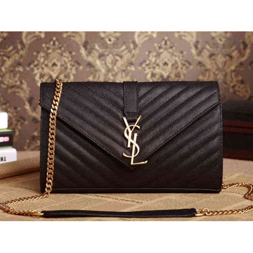 SAC FRONTAL CLASSIC FLAP CU SEMNĂTURĂ YSL METALICĂ ÎN TONURI AURII, MATELASSÉ CUSĂTURI ȘI CUREA DE LANȚ DUBLĂ GURMANDĂ METALICĂ CARE POATE FI PURTATĂ PE CORP SAU PE UMĂR.